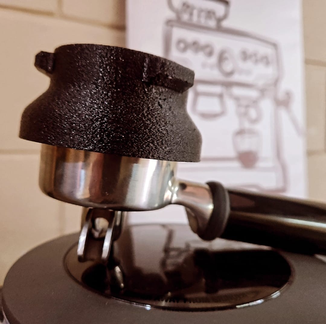 Twist the funnel onto the portafilter and insert into the grinder cradle. Once you’ve dosed, simply tamp while it’s attached to save time.